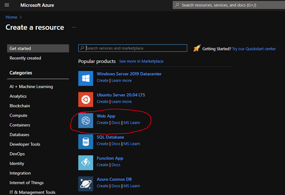 Azure predefine una serie de elementos comunes para crear en sus recursos, para este articulo vamos a hacer clic en la opción Web App como se muestra a continuación.