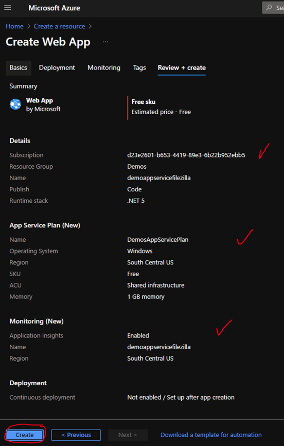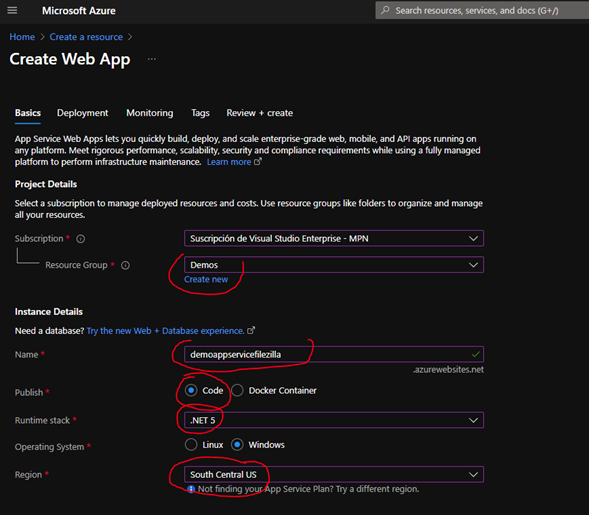 Una vez ido al formulario de creación de una web app para App Services vamos a seleccionar la suscripción como primera opción, luego vamos a crear un recurso nuevo, en mi caso yo le llame Demos, como siguiente opción damos un nombre a la web app, esta a la vez será la url a la cual vamos a acceder desde la internet yo le llame demoappservicefilezilla, en publicación dejamos en la opción Código, luego en la opción Runtime la verdad puedes elegir cualquiera, el interés de este demo es acceder a los archivos que están en este espacio reservado para alojar nuestra app, en mi caso seleccione .NET 5, en la opción de sistema operativo lo dejamos como quedo por defecto, en este caso Windows y en la región, agreguen la que mas les haga sentido, para este demo seleccione South Central US.