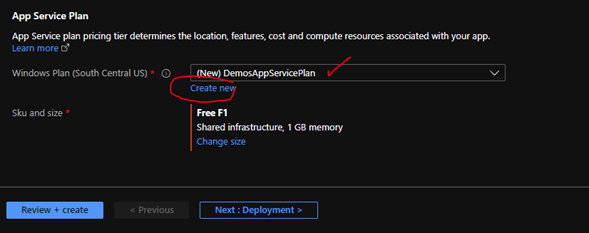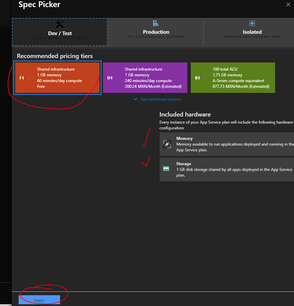 en la sección de App service plan, yo como no tenia ninguna nueva le di a crear nuevo plan y del lado derecho se va a desplegar una página donde aparecerán los distintos esquemas de precios que nos ofrece app service para hospedar, primero seleccionar en sus distintos ambientes (Dev/Test – Production – Isolated), vamos a hacer para efectos de este demo clic en la primera opción (Dev / Test) y seleccionaremos el tier F1 que es gratuito donde nos ofrece 1 GB de memoria y 60 minutos al día de cómputo, esto quiere decir que entre cada transacción ya sea de request o response este nos va a consumir dentro de nuestro rango de tiempo que ofrece diario este tier que no sobrepase de los 60 minutos lo cual para pruebas y demos esta mas que suficiente, mas no es una instancia que debemos dejar luego cuando queramos ir a producción o ambientes más públicos.