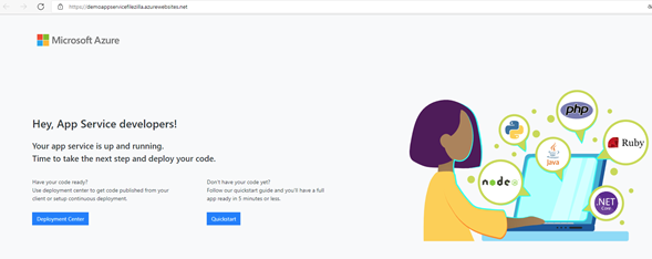 Para comprobar que todo esta al 100% funcional con nuestra app web vamos a buscar la opción de Browse en la pagina principal del recurso que pertenece a nuestra app web o bien ubicar la opción URL y hacer clic en la opción de copiar y pegar la ruta en nuestro navegador web para confirmar que ya tenemos nuestra app web ejecutándose sin problemas como se muestra a continuación.