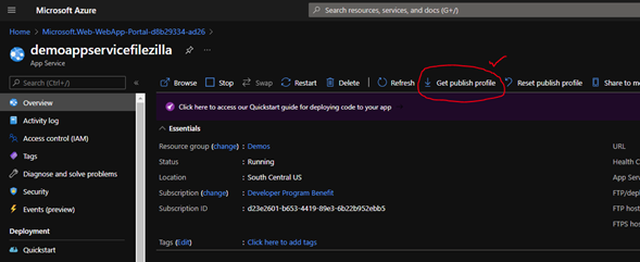 Aquí el truco para conectarnos mediante ftp a cualquier web app es obtener el perfil de publicación que nos ofrece app service en la pagina principal de aquel recurso que creemos, vamos a ubicar la opción Get Publish Profile y hacemos clic para descargar el archivo con extensión .PublishSettings como se muestra a continuación.