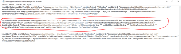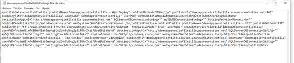 Una vez descargado el archivo lo ubicamos y abrimos con nuestro bloc de notas y vamos a hacer clic en la opción formato y hacemos clic en ajuste de línea para que no se abra el archivo y se muestre todo en 1 sola línea y se vea mas entendible el archivo, luego vamos a notar que parece código xml con configuración relevante usuarios, contraseñas, urls, en realidad lo que estas descargando son los perfiles para conexión mediante ftp, ftp pasivo y webapp que luego veremos en otros artículos como sacarles el máximo provecho para hacer liberaciones de nuestras aplicaciones de una manera más rápida y sencilla, continuando con el articulo vamos a ubicar el tag de publishProfile y para que sea mas entendible hagamos enter para dar espacios y de ahí sacar el perfil que nos interesa que es el FTP como se muestra en las siguientes imágenes.