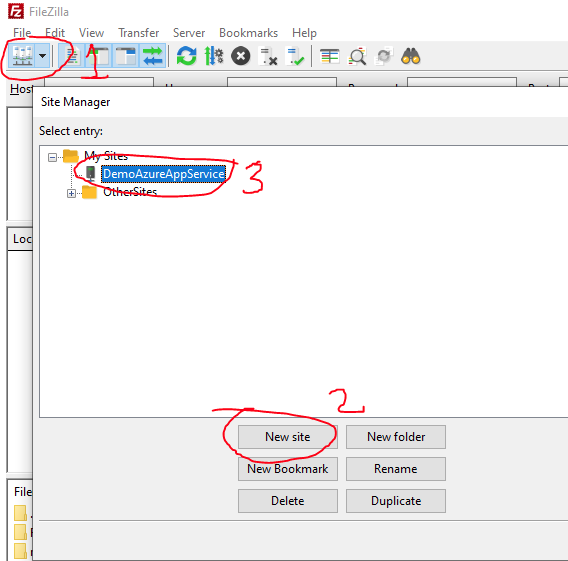 Ok entonces ya teniendo los datos de conexión abrimos Filezilla y hacemos clic en el primer icono del lado izquierdo que es donde se nos va a desplegar una ventana de configuración de conexiones y vamos a hacer clic en la opción New Site, le damos un nombre a nuestro site, en mi caso coloque DemoAzureAppService como se muestra a continuación.
