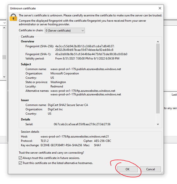 Hasta este paso ya vamos muy bien, solamente se nos mostrará una ventana mostrándonos el certificado de conexión entrante que nos permitirá hacer conexión con el recurso de Azure mediante el protocolo FTP, simplemente hacemos clic en OK.