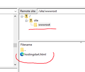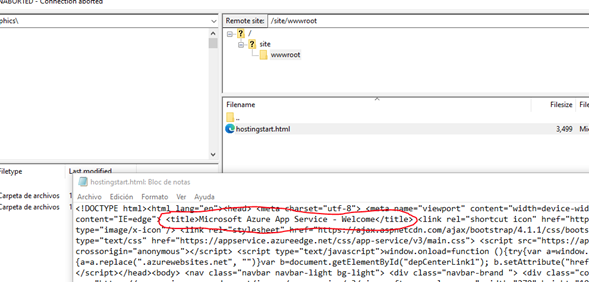 Hasta este punto ya nos podemos conectar mediante ftp a nuestra web app y poder hacer gestión de nuestros archivos, en este caso solo se ve un archivo que es el que predefine Azure al momento de crear un recurso de app service que es el archivo hostingstart.html.