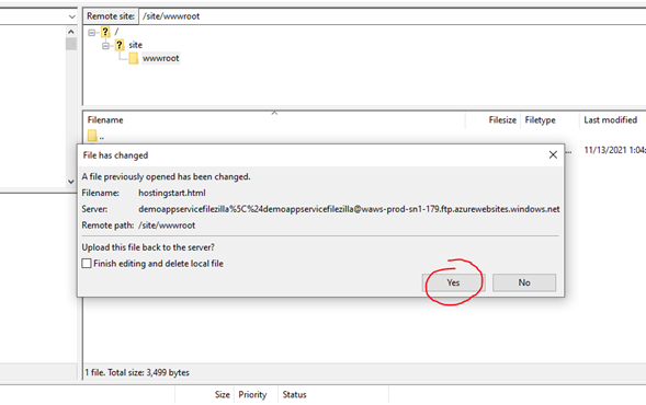 Se nos mostrara una ventana donde vamos a confirmar los cambios realizados en el servidor propiamente en el archivo hostingstart.html y hacemos clic en Yes.